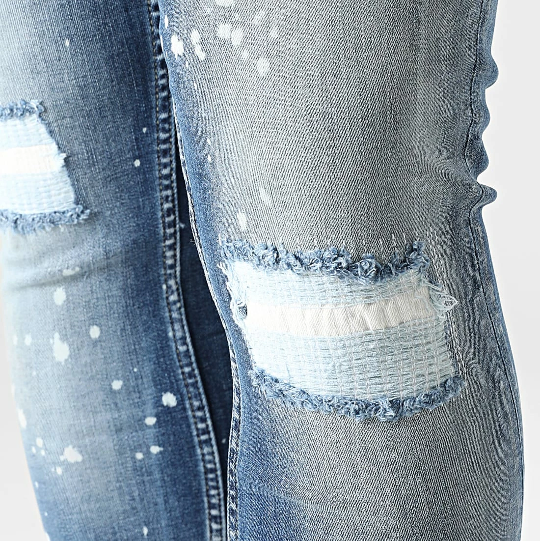 • Jean skinny finition usée, délavée et tachée avec rapiéçages