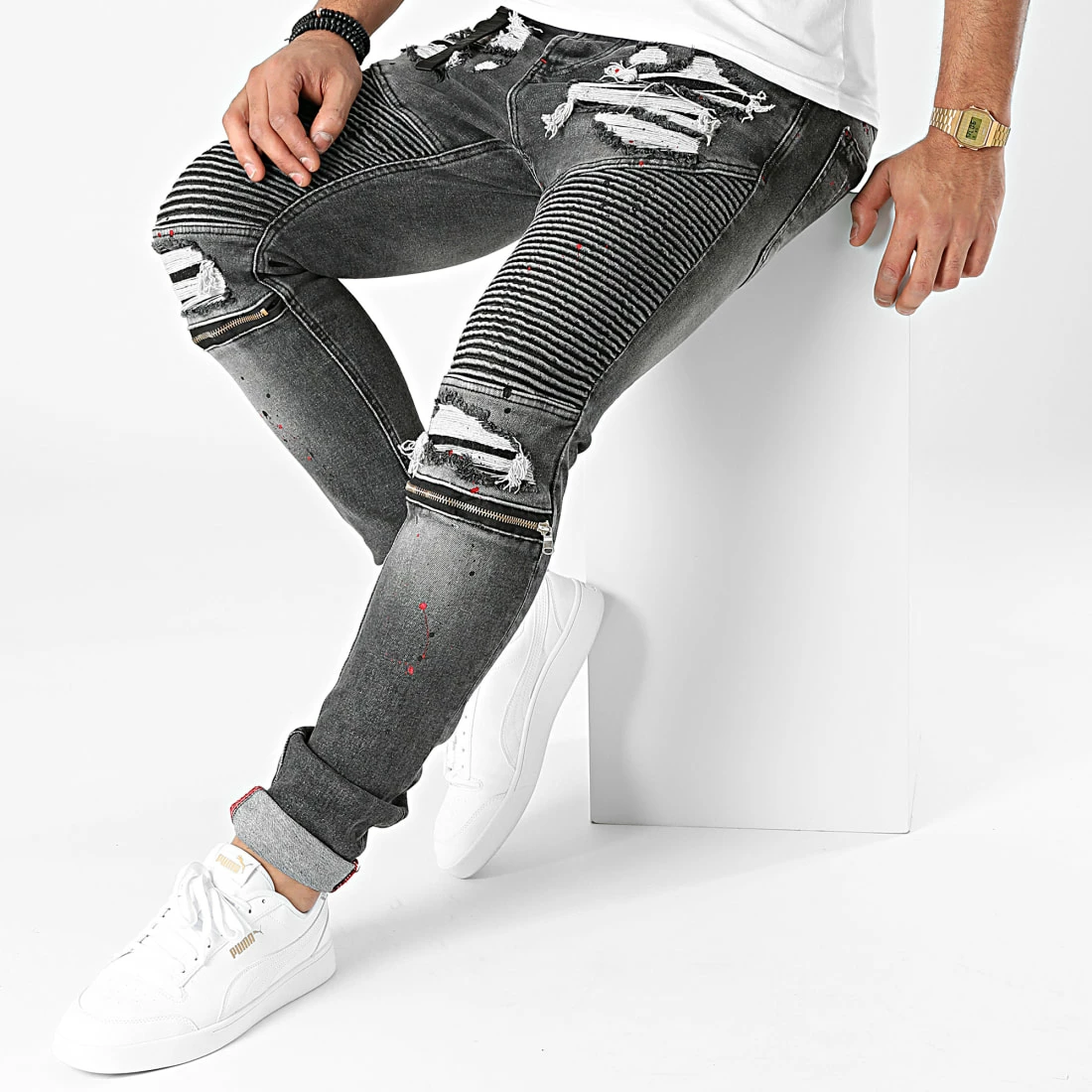 • Zip métallique décoratif aux genoux -