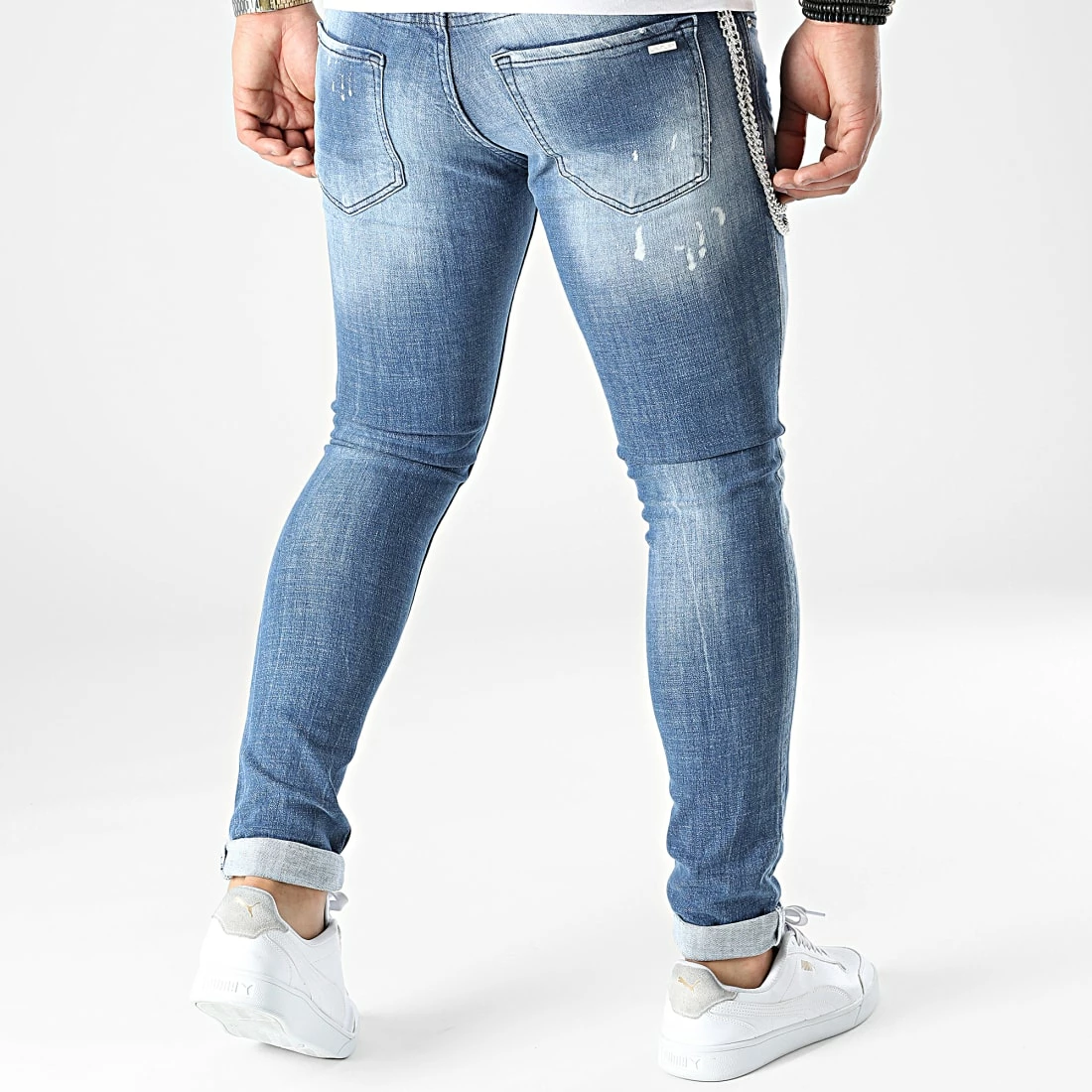 • Jean skinny finition tachée, usée et délavée avec rapiéçages