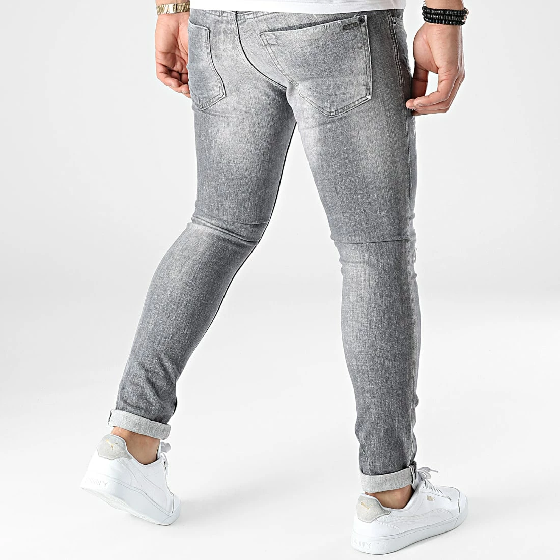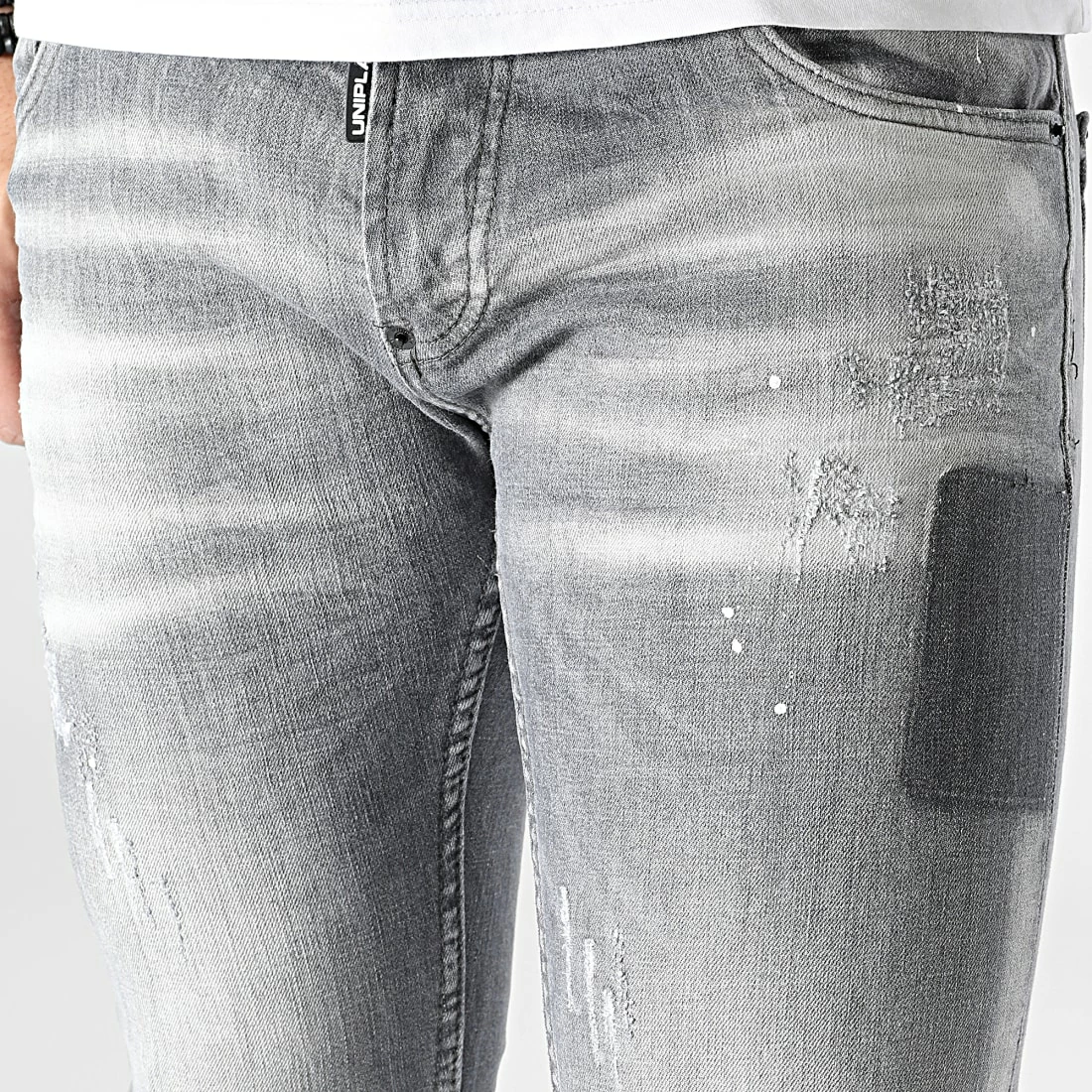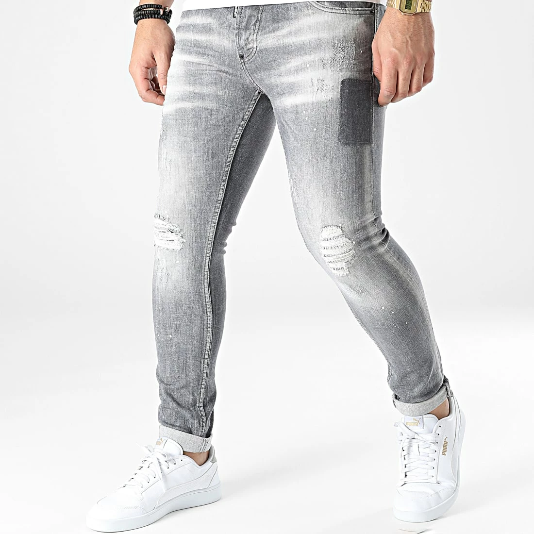 • Jean skinny finition tachée, usée et délavée avec rapiéçages