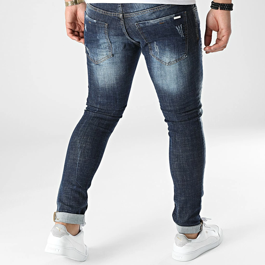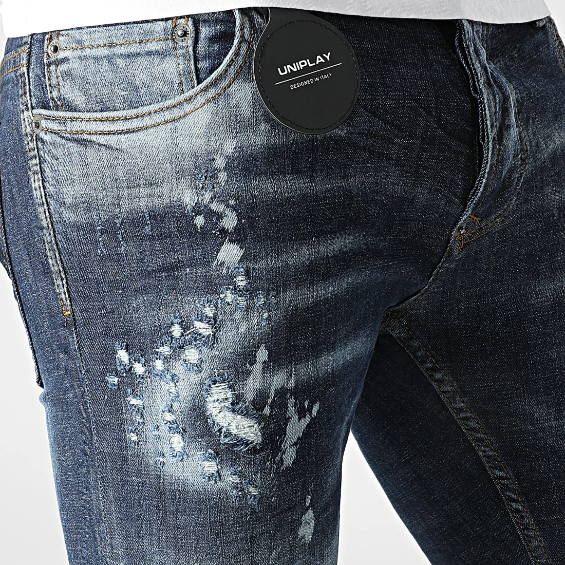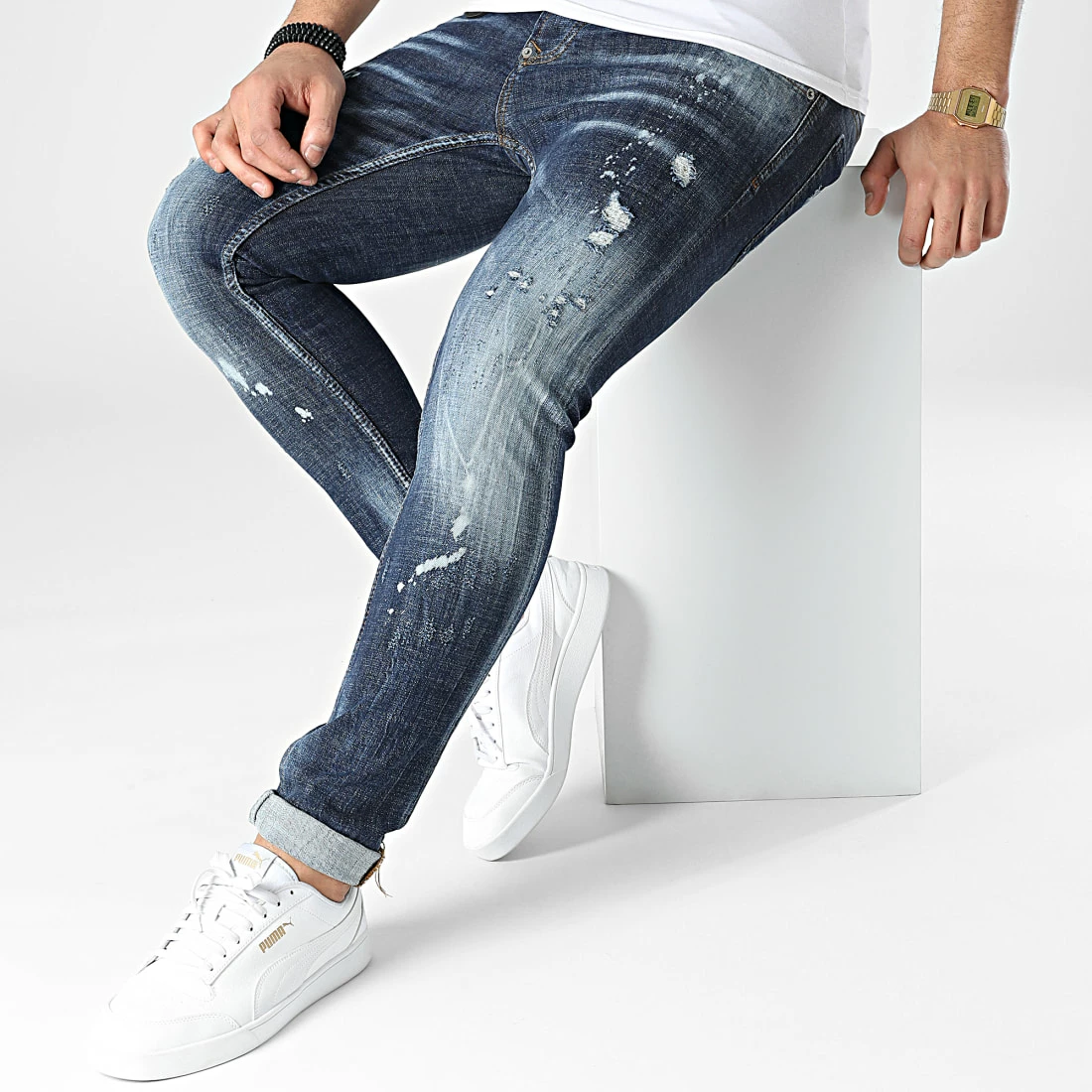 • Jean skinny finition tachée, usée et délavée avec rapiéçages