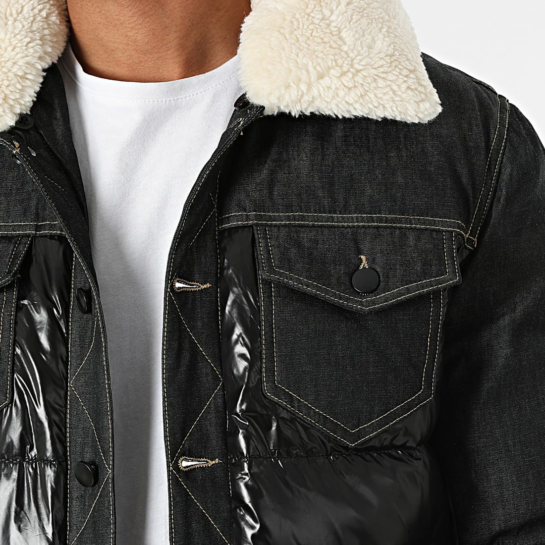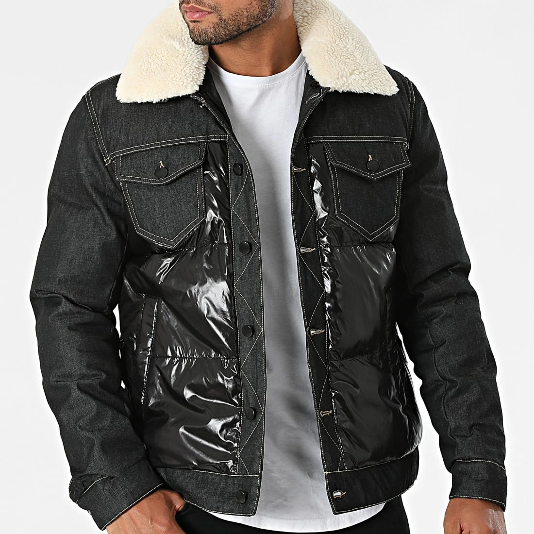 • Veste rembourrée bi-matière avec col amovible en fourrure synthétique aspect mouton