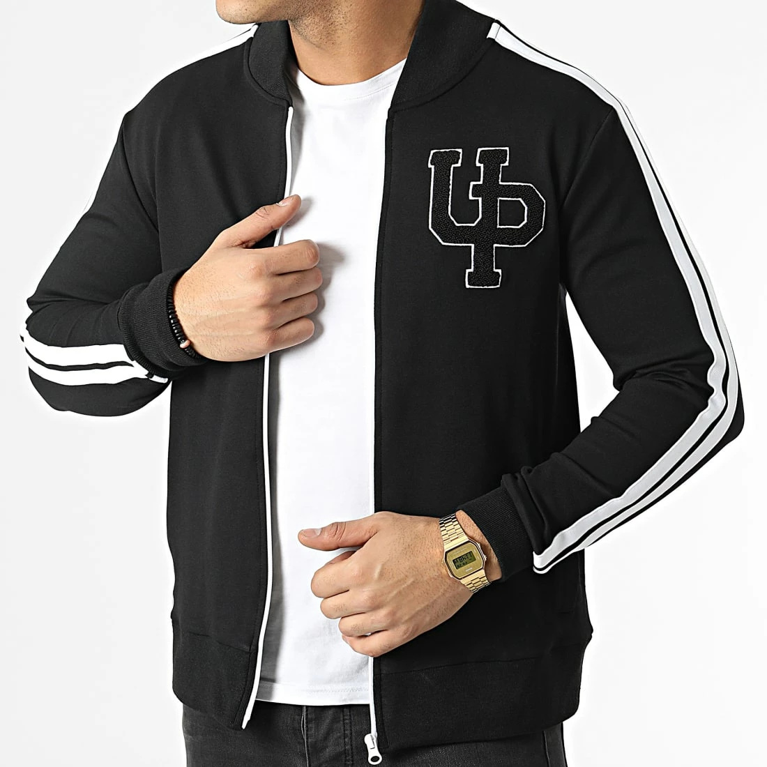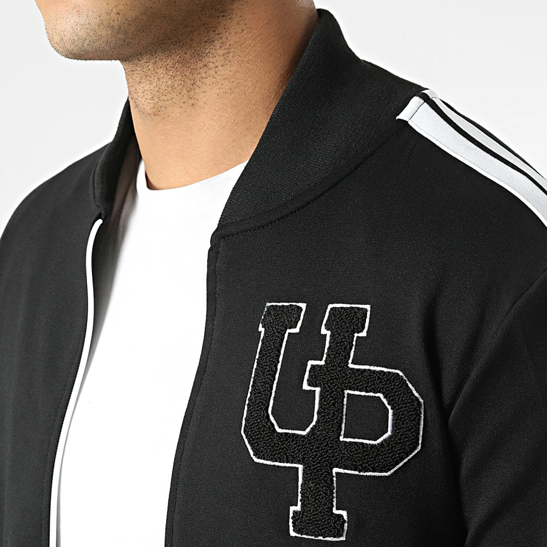 • Veste zippée en tissu stretch brodée bandes sur les manches et visuel sur la poitrine